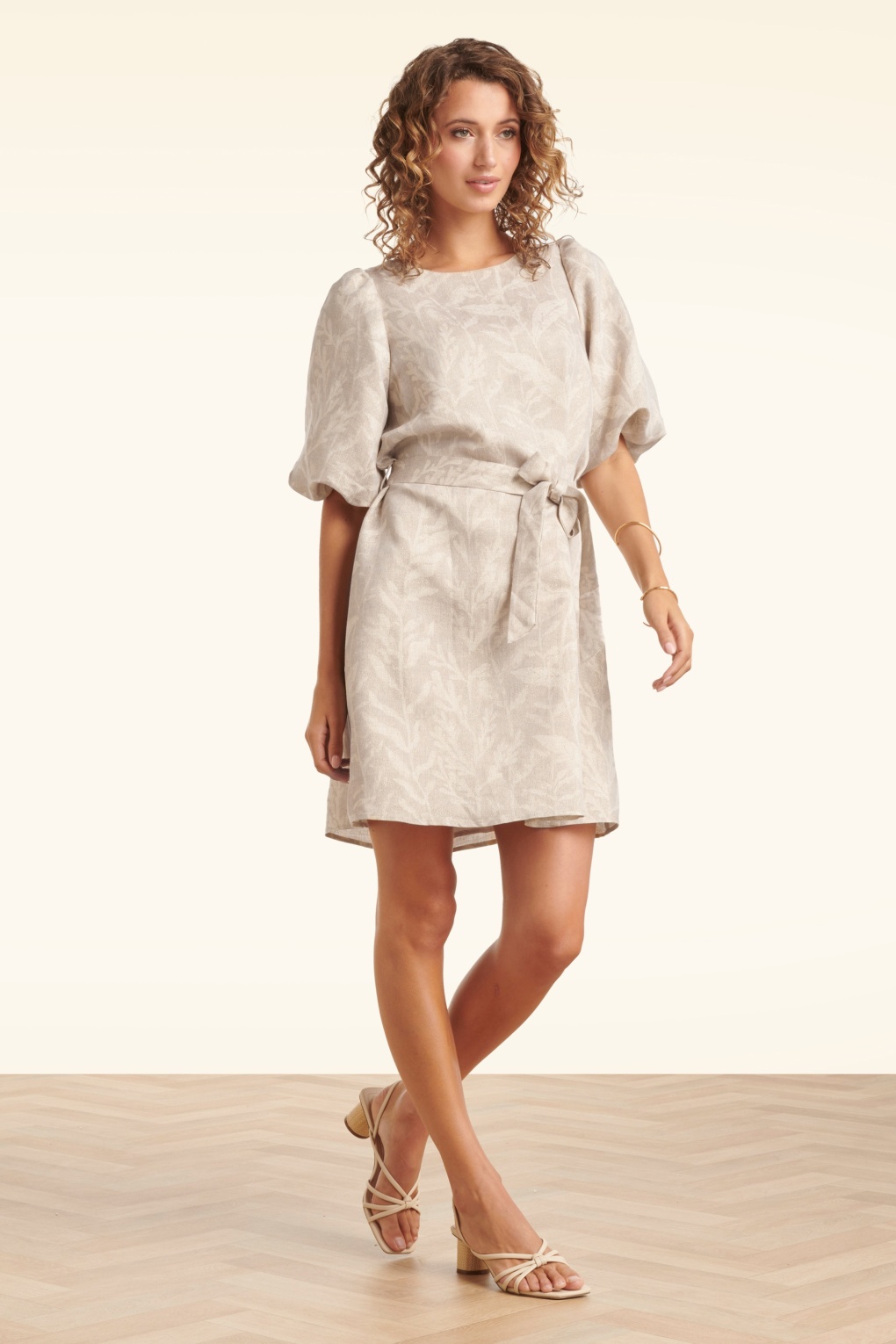 “Golden threads, daydream energy.” Deze zandkleurige a-lijn jurk met ballonmouwen is uitgevoerd in een stevige maar soepele, luchtige linnen-look stofmix voorzien van een goudkleurige shimmer. * Ronde halslijn * 1/2 ballon mouwen  * Afneembaar striklint, voor een extra ‘snatched’ taille * Geen rits of knopen, aantrekken en ‘ready to go’ * Gevoerd  * Reikt bij een lengte van 1,70 m tot boven de knie