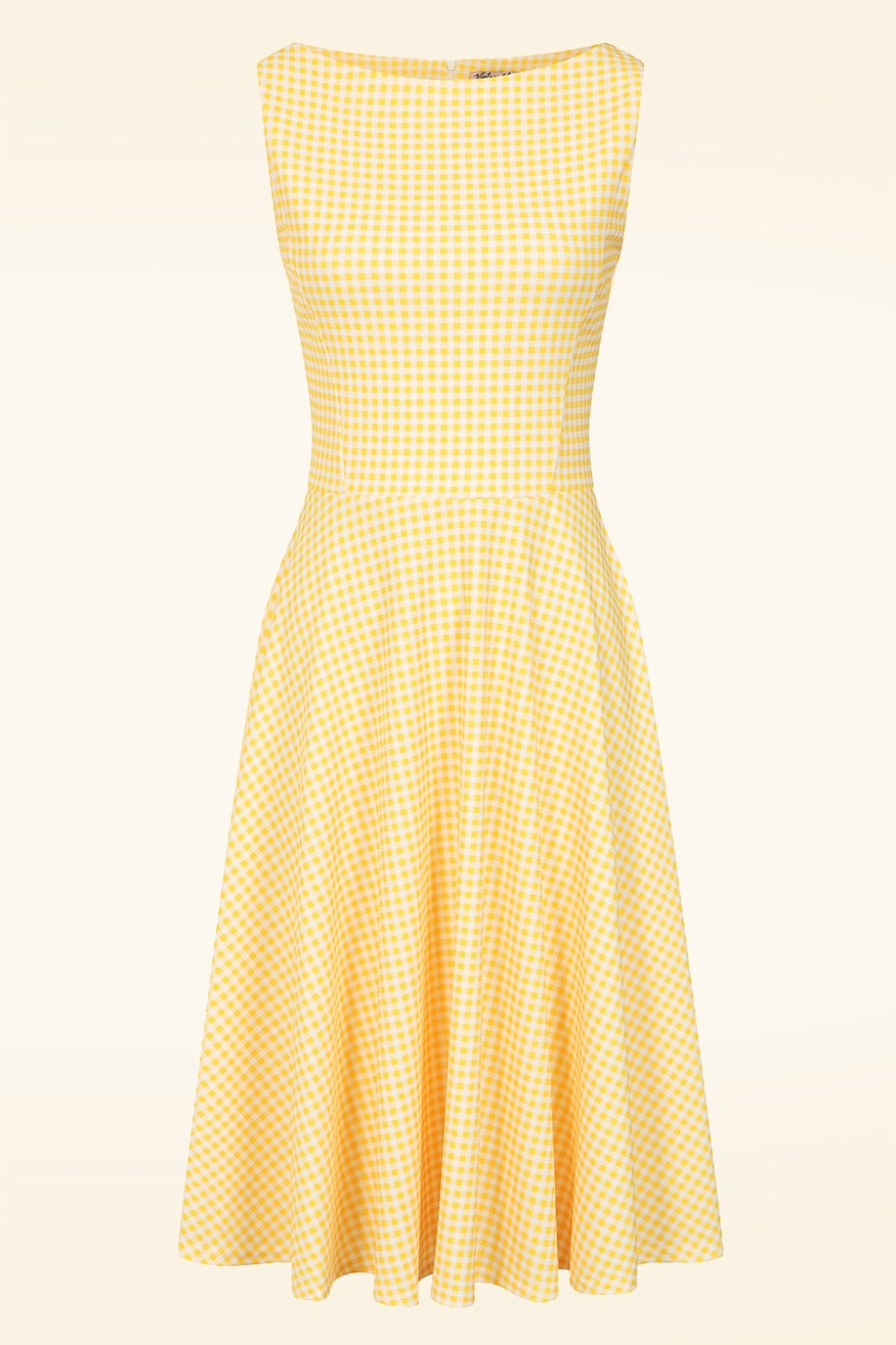 “Picnic-perfect charm.” Deze swing beauty is een echte klassieker met een speelse twist! De mouwloze top is gevoerd voor extra comfort en loopt vanaf de taille uit in een zwierige swingrok die bij elke stap elegant meebeweegt. Ze is uitgevoerd in een stevige maar soepele stofmix met een fijne stretch en een charmante gingham print in geel en wit.    * Swing stijl * Boothals * Gevoerde top voor extra comfort * Mouwloos * Blinde rits achterzijde * Valt net over de knie bij een lengte van 1,70 m * Exclusief bij Topvintage verkrijgbaar
