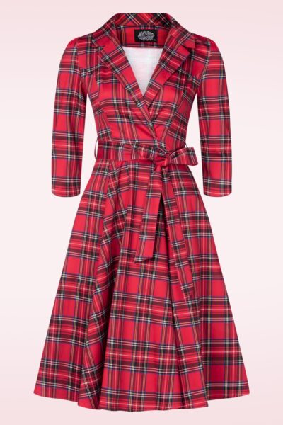 “Swing into tartan dream!” Zwier elegant in deze charmante swing jurk met klassieke tartan ruit. Exclusief verkrijgbaar bij Topvintage, heeft ze een chique reverskraag met vaste overslag en loopt vanaf de taille uit in een zwierige swingrok die sierlijk met je meebeweegt bij elke stap. Uitgevoerd in een stevige maar soepel vallende rode katoenmix, die comfortabel draagt en perfect is voor zowel dagelijkse looks als feestelijke gelegenheden. Een retro-geïnspireerde must-have die je garderobe een speelse, stijlvolle twist geeft.   * Swing jurk * Revers kraag * Vaste overslag * 3/4 pofmouwen * Voorzien van zakken! * Afneembaar striklint, voor een extra ‘snatched’ taille * Blinde ritssluiting aan de zijkant * Te combineren met een petticoat voor een extra feestelijk effect * Valt bij een lengte van 1,70 m over de knie * Exclusief verkrijgbaar bij Topvintage