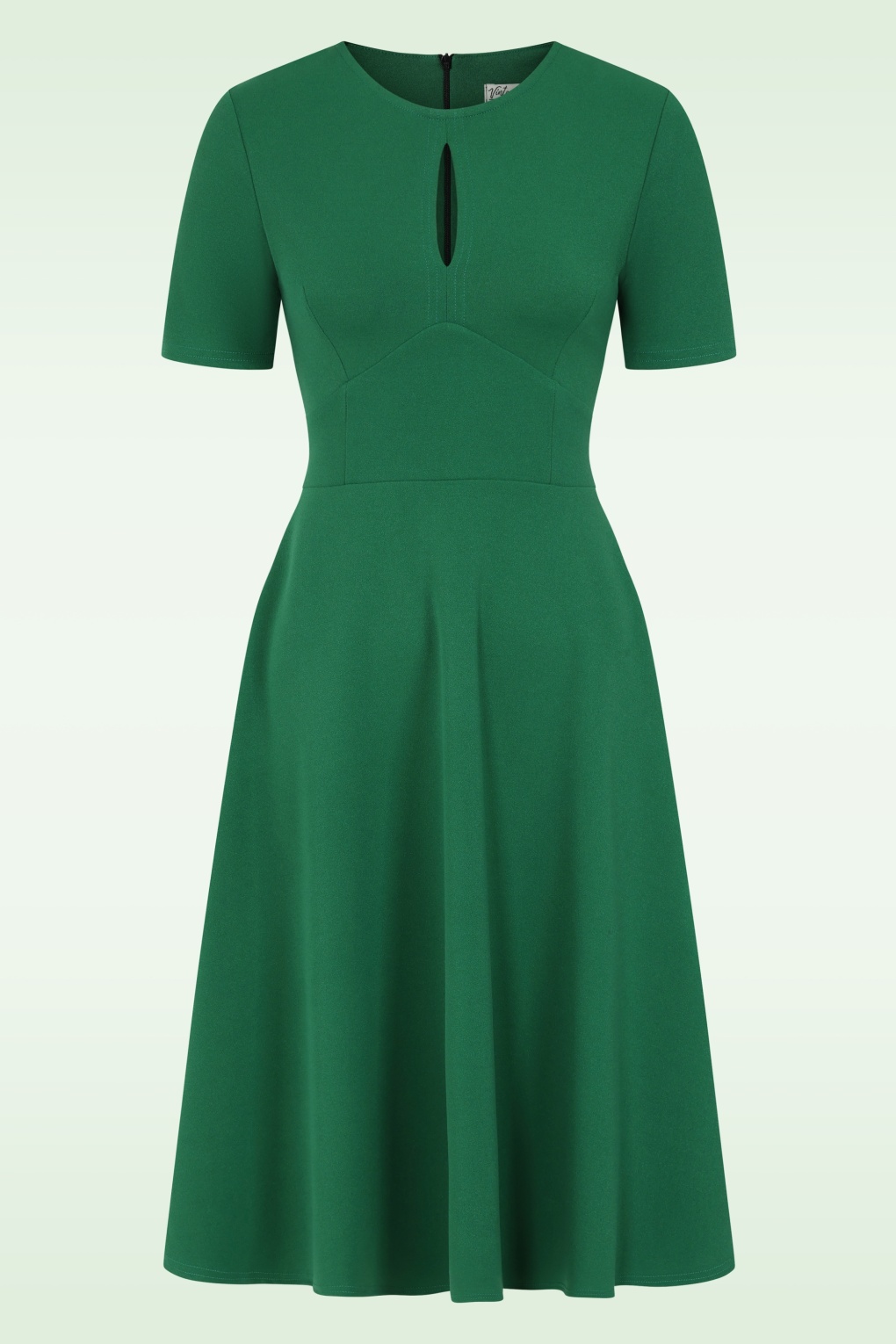 “Emerald moments that matter.” Swing beauty Solange heeft een hoge halslijn met open detail, korte mouwen en een zwierige rok die voor een klassiek silhouet zorgen. Uitgevoerd in een stevige maar soepele, stretchy crêpe-achtige stofmix in smaragdgroen.   * Semi-swing model * Hoge halslijn * Korte mouwen * Blinde rits achterzijde * Reikt bij een lengte van 1,70 m net over de knie * Exclusief bij Topvintage verkrijgbaar