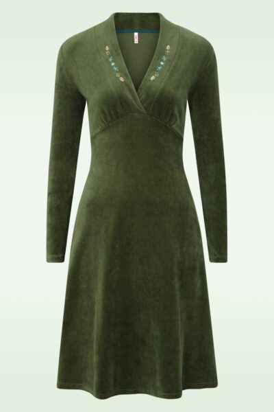 “Cozy, chic, and made to move.” Deze beauty heeft lange mouwen en een vrouwelijke V-hals met sjaalkraag, afgewerkt met prachtige geborduurde bloemetjes. Ze loopt uit in een zwierig A-lijntje dat elke figuur flatteert. Uitgevoerd in een supercomfortabele, zachte en stretchy bio-katoenmix met de luxe look & feel van fluweel, in een prachtige groene kleur. * A-lijn model * V-halslijn met sjaalkraag * Geen rits of knopen; aantrekken en ready to go! * Valt net over de knie bij een lengte van 1,70 m