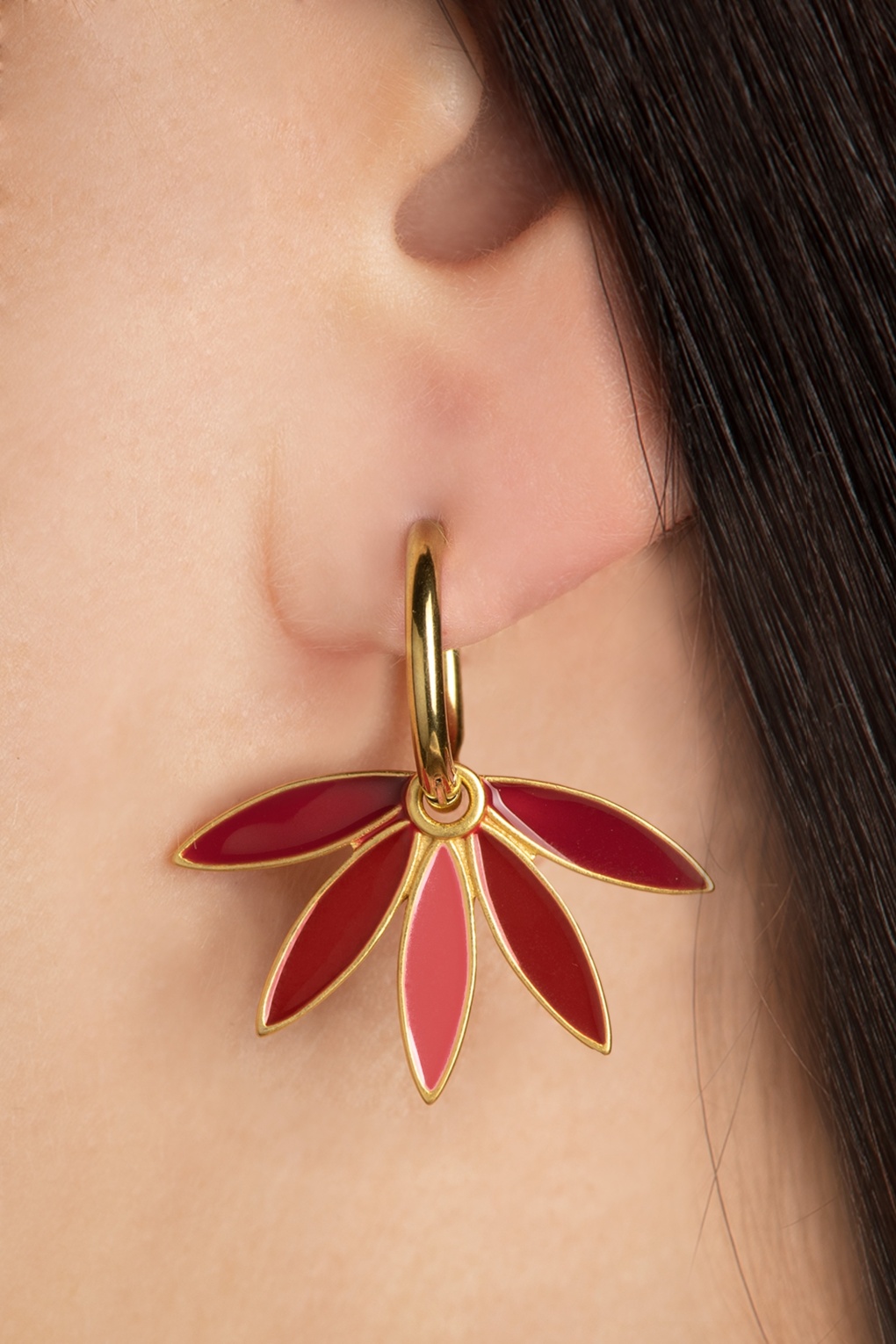 Gemma is Latijn voor ‘bladknop’ en de Italianen bedoelen er juweel of edelsteen mee. Het kon dus niet anders dan dat deze rode emaille oorbellen, met bladvorm, zo moesten heten. Uitgevoerd in (14K) verguld messing met een verguld RVS ringetje die eenvoudig open en dicht klikken. * Ringetjes met hanger * Verguld (14K) RVS en messing * Emaille * Verkleuren en vlekken niet * Nikkelvrij (anti-allergeen)