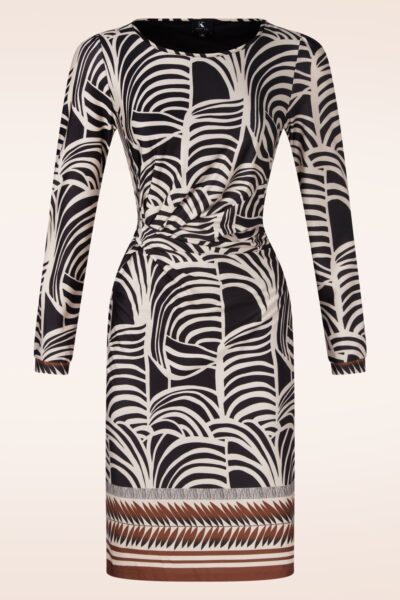 ”She’s a top knot!” Deze Veronique jurk heeft een subtiele A-lijn en is uitgevoerd in een soepele en stretchy, gladde slinky stof met een StayFresh coating en een zwart/witte print met bruine details aan de onderzijde.   * Subtiele A-lijn * Lange mouwen * Gevoerd * Geen rits of knopen; aantrekken en ready to go! * Valt bij een lengte van 1,70 m tot net boven de knie