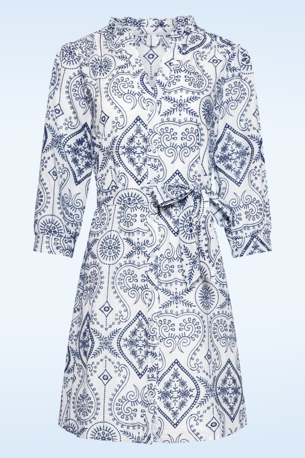 “Elegance is in the details.” Maak kennis met Victoria, een frisse en vrouwelijke a-lijn jurk die perfect is voor het komende seizoen. Ze heeft een V-halslijn met een subtiel opstaand roezelkraagje, 3/4 wijde pofmouwen en een functionele knopenreeks aan de voorzijde. Het prachtige marineblauwe broderie anglaise patroon op wit zorgt voor een tijdloze, romantische touch. Uitgevoerd in een lichte en luchtige katoen, die heerlijk draagt. * Loose-fit model * Gevoerd * V-hals met opstaand roezelkraagje * 3/4, wijde pofmouwen  * Knopenreeks * Afneembaar striklint, voor een extra ‘snatched’ taille  * Valt bij een lengte van 1,70 m boven de knie