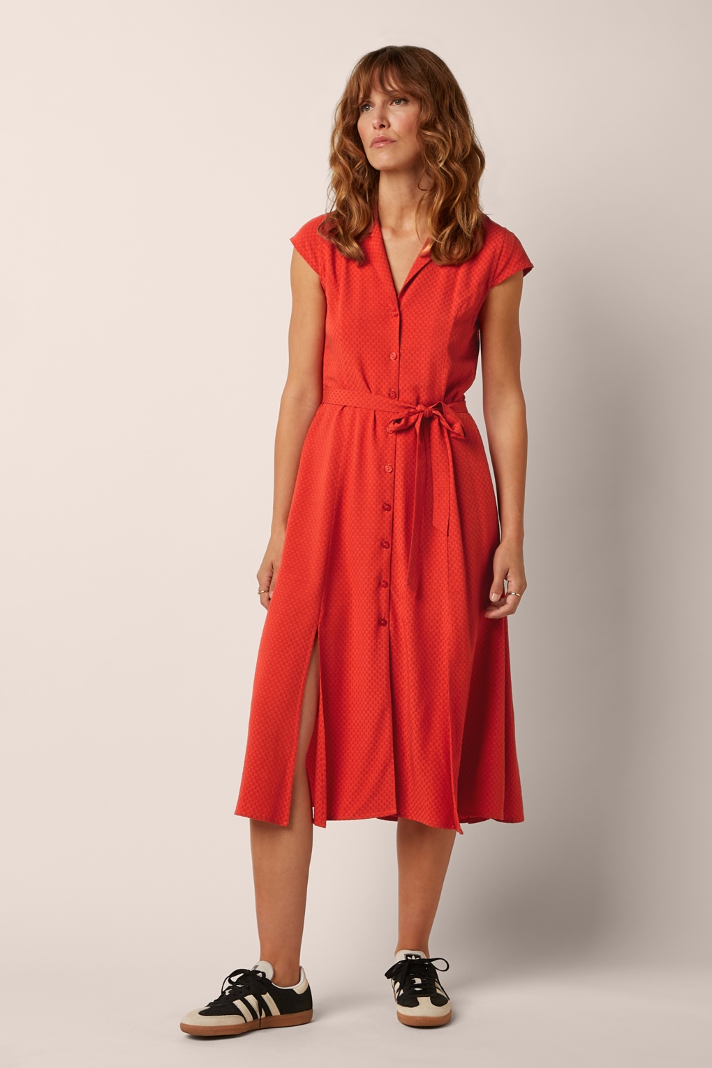 “Je t’adore!” Deze midi-jurk heeft een elegante reverskraag, korte kapmouwtjes en loopt uit in een zwierige rok met speelse splitjes. Ze draagt heerlijk dankzij de soepele en luchtige viscose met een subtiele structuur. * Midi jurk * V-halslijn met revers kraag * Korte kapmouwtjes * Knopenrij * Afneembare strikband voor een extra ‘snatched’ taille * Voorzien van splitjes * It has pockets! * Reikt bij een lengte van 1,70 m tot op de kuit