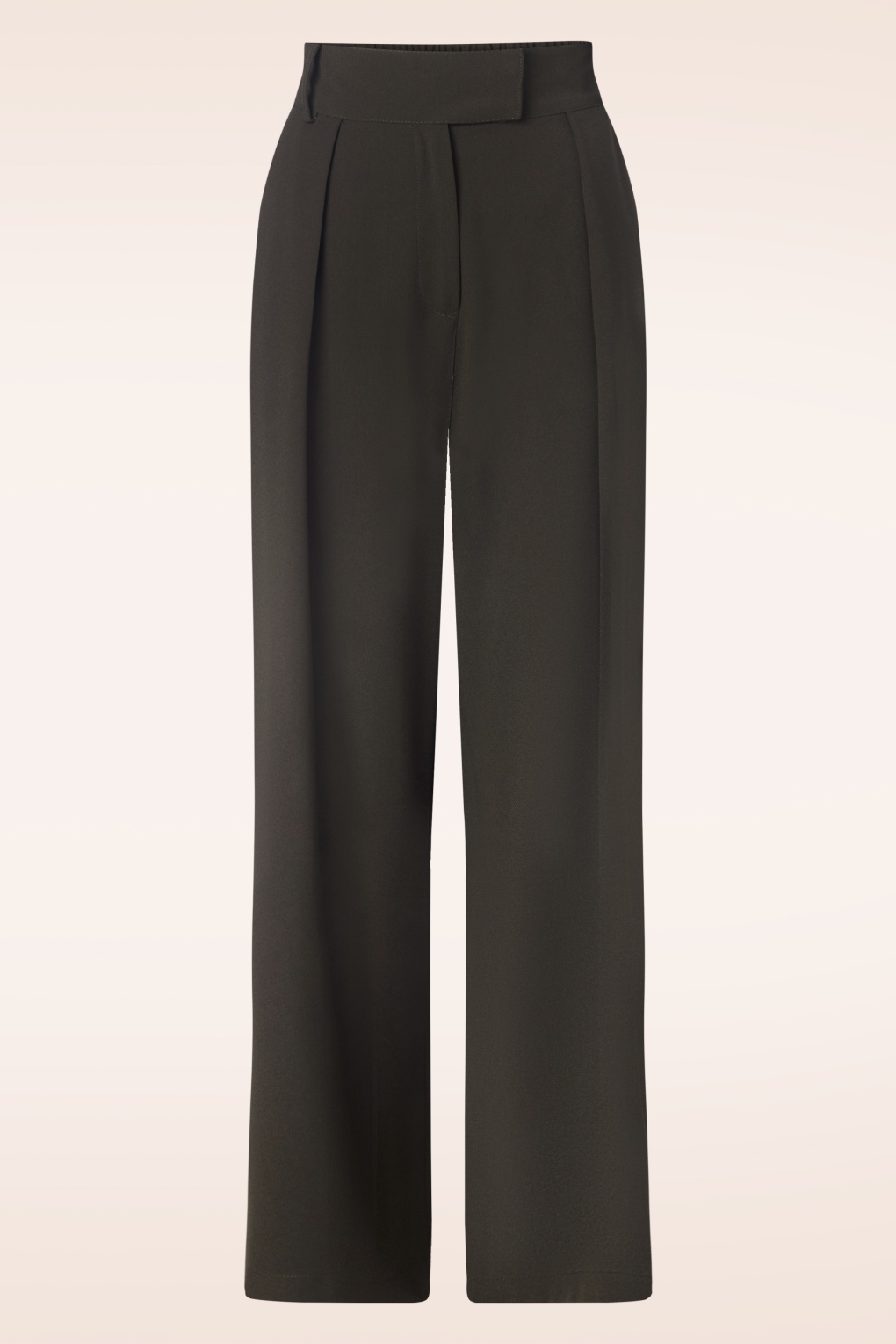 Deze elegante pantalon is een must-have voor de klassieke vintage ladies onder ons! De wijde pijpen vormen een prachtig contrast met de hoge taille en heeft een super afkledend effect, ook als je vollere heupen/billen hebt. Uitgevoerd in een soepele, crêpe achtige, bruine stof (stretcht niet) voorzien van elastiek in de tailleband voor een comfortabel draag comfort. Met deze classy beauty ben jij op en top gekleed!   * Hoog taille model * Lusjes voor je riem * Zijwaartse steekzakken * Rits- met verborgen haaksluiting voorzijde * Wijde pijpen  * Let op; de kleur van het product op de video kan afwijken van de daadwerkelijke kleur van het product
