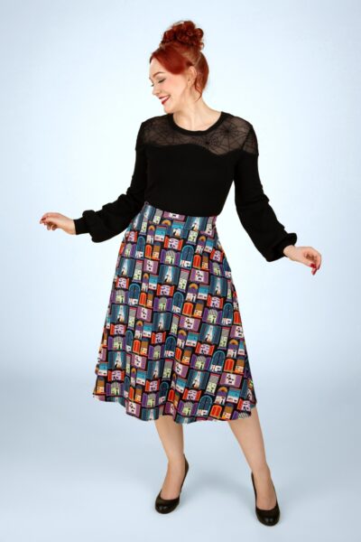 ”This witch can be bribed with cats!” Deze purr-fecte swing rok is uitgevoerd in een stevige maar soepele, zwarte katoenmix met een meow-mazing spooky print die prachtig met je mee beweegt. * Vol swing model: kan gecombineerd worden met een van onze petticoats * It has pockets! * Rits met haaksluiting achterzijde * Valt bij een lengte van 1,70 m over de knie