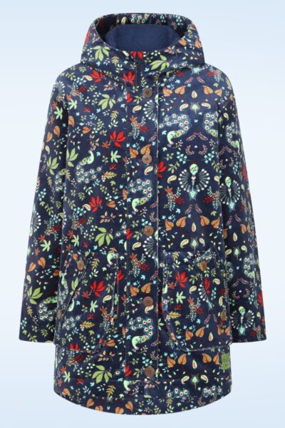 “Your perfect companion for cozy adventures.” De Woodland Walker is een echte eye-catcher! Dankzij de dijlange snit met capuchon, verstelbare taille en ruime zakken is ze de ideale metgezel voor koelere dagen. De tweewegsrits met kinbescherming, duurzame kokosnootknopen en zachte voering zorgen voor warmte en praktisch draagplezier. Ze is uitgevoerd in een biologische corduroy katoenmix met een speelse all-over print van pauwen en bloemen — een perfecte combinatie van comfort, functionaliteit en unieke stijl. * Gewatteerde jas * Vaste capuchon * Lange mouwen  * Tweeweg ritssluiting met kin bescherming voorzijde * Duurzame knopen van kokosnoot  * Voorzien van zakken  * Voorzien van een trekkoord in de taille voor een perfect aanpasbare pasvorm * Valt bij een lengte van 1,70 m boven de knie * Gemaakt van gerecyclede materialen