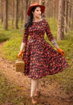 ”Fall-ing for you all over again!” Ga voor een kleurrijke look dit najaar met deze Adriana herfst swing jurk! Het aansluitende lijfje heeft een prachtige boothals, 3/4 mouwen en vanaf de taille loopt ze uit in een zwierige swing rok waardoor jij een super vrouwelijk silhouet krijgt. Uitgevoerd in een stevige maar soepel vallende, wijnrode katoenmix met een lichte stretch, voorzien van een geweldige print met egels en eekhoorntjes in verschillende oranje tinten. Ben jij al verliefd? 😉 * Full swing model * Boothals * 3/4 mouwen * Zijwaartse steekzakken * Combineer met een van onze petticoats voor een extra feestelijk effect * Blinde rits achterzijde * Valt bij een lengte van 1.70 m over de knie
