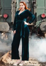 ”Time to make an unforgettable entrance!” Dit seizoen hebben onze eigen in-house ontwerpers zich laten inspireren door de iconische stijl van Ava Gardner in de film ‘Barefoot Contessa’. Celeste is uitgevoerd in een high quality, tealkleurige stof met een fijne stretch in een luxe fluwelen look die bovendien een genot is om te dragen. ”They will forever remember your name from now on, Diva!” * V-halslijn met overslag * Lange pofmouwen met manchetten * Bra strap holders zodat je bh-bandjes niet gaan schuiven * Gevoerde top * Afneembare strikband voor een extra ‘snatched’ taille * Lange wijde pijpen * Blinde rits aan de achterzijde * Stella Rose Cherry is 1,71 m: haar pumps zijn haar eigen vintage treasures * Marjolein is 1,82 m