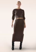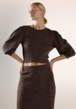 “Glow your own way.” Deze kortere top is uitgevoerd in een soepele, stretchy, fijngebreide bruine viscosemix voorzien van een ingewerkte zilverkleurige glitterdraad. * Ronde halslijn * 3/4 pofmouwen * Stretchy ribboorden * Korter stijltje; net lang genoeg om op een high-waist broek te dragen * De matching midi rok is apart verkrijgbaar