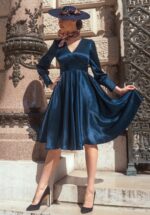 ”When glam speaks, everyone listens!” Dit seizoen hebben onze eigen in-house ontwerpers zich o.a. laten inspireren door Jean Harlow en haar prachtige, satijnen jurken! Cybele is uitgevoerd in een zacht en glanzend, non-stretchy stofje in navyblauw met de luxe look and feel van satijn. Je lichaam wordt bovendien op sublieme wijze geaccentueerd door de corrigerende bengaline shapewear. ”Always walk into a room like you invented glamour, Diva!” * V-hals * Geheel gevoerd (op de mouwen na) * Lange pofmouwen met manchetten * Bra strap holders zodat je bh bandjes niet gaan schuiven * Corrigerende bengaline shapewear * Blinde rits en keyhole detail met knoopje achterkant * Gorgeous influencer Miss Alba Banana is 1,75 m: haar accessoires en pumps zijn haar eigen vintage treasures