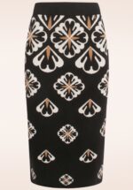 ”Let’s put on my favourite knitted skirt!” Deze beauty is uitgevoerd in een zware maar soepele, fijngebreide zwarte stretchy stof voorzien van een grafische bloemenprint en ingewerkte glitterdraad in crème en zand, die heerlijk draagt! * Aansluitende fit * Tailleband voorzien van elastiek * Geen rits of knopen; aantrekken en ready to go! * Valt bij een lengte van 1,70 m halverwege de kuit * De afgebeelde sweater is niet verkrijgbaar in onze shop