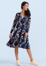 “Nature-inspired elegance, sustainably made!” Deze semi-swing jurk in marineblauw heeft een vaste overslag, lange mouwen en een betoverende print van kraanvogels en bloemen in crème. Ze is uitgevoerd in een superzachte, soepele en stretchy EcoVero viscosemix die heerlijk comfortabel draagt. * Semi-swing * Vaste overslag * Lange mouwen * Geen rits of knopen; aantrekken en ready to go! * Valt bij een lengte van 1,70 m over de knie