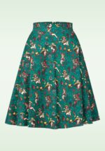 “Wild West with a rockabilly twist!” Deze donkergroene swingrok is alles wat je zoekt: vrouwelijk, speels én stoer. Ze heeft een flatterende hoge taille, handige zakken (yes, zakken!) en zwiert prachtig met je mee bij elke stap. De print met cowgirls geeft haar een unieke retro vibe die perfect past bij een rockabilly look. Uitgevoerd in een stevige maar soepele katoenmix met een vleugje stretch voor extra draagcomfort. * Swing model * Voorzien van zakken * Valt bij een lengte van 1,70 m op de knie