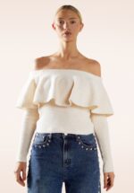 “Flirt in cream.” Deze ietwat kortere off-shoulder top met roezel is uitgevoerd in een soepele, stretchy, fijngebreide, gemêleerde stofmix in crème voorzien van een vleugje wol. * Off-shoulder * Roezel * Lange mouwen * Korter stijltje; lang genoeg om op een high-waist (broek) te dragen