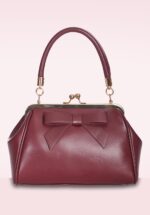 ”Just a daydream away!” Dit kleine zusje van de klassieke American Vintage bag heeft een opvallende goudkleurige metalen klipsluiting voor een echte vintage look en is uitgevoerd in bordeauxrood mat imitatie leder afgewerkt met een schattige strik. * Small sized * Klipsluiting * Binnenvak met 3 extra vakjes, waarvan 1 met rits * Afneembaar hengsel * Kan crossbody gedragen worden * Volledig gevoerd * Groot genoeg voor je telefoon, sleutels, en een kleine portemonnee