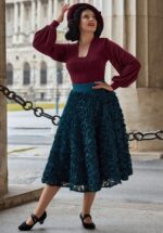 ”Infuse your ensemble with a dash of retro charm!” Een pracht exemplaar uit nieuwe collectie van Miss Candyfloss: ”Vintage Glam Icons”. De collectie is geïnspireerd op de glamoureuze eerste super modellen! Edelina Kat is uitgevoerd in een soepele en opengewerkte petrol stof voorzien van een 3D- bloemenmotief en is volledig gevoerd met een satijnachtige stof. * Swing rok * Brede tailleband * Gevoerd * Blinde ritssluiting achterzijde * Voorzien van zakken! * Valt bij een lengte van 1,70 m over de knie