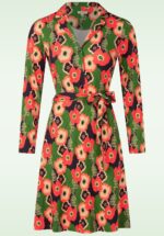 ”Retro blooms, timeless grooves!” Deze jurk is een echte eyecatcher dankzij haar kleurrijke retro bloemenprint in o.a. groen en oranje. Ze heeft een elegante reverskraag, lange mouwen en een speelse A-lijn die vanaf de taille prachtig uitwaaiert. Uitgevoerd in een heerlijk soepele en stretchy EcoVero viscosemix, die niet alleen comfortabel draagt maar ook een duurzame keuze is. * A-lijn * Revers kraag * Knoopjes voorzijde * Afneembaar striklint * Valt bij een lengte van 1,70 m net over de knie
