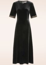 “This dress is a real showstopper!” Ze is uitgevoerd in diepzwart, glanzend fluweel van een zware kwaliteit dat licht stretcht en is afgewerkt met strassteentjes en goudkleurige pailletten en kraaltjes aan de halve mouwtjes. * Maxi jurk * Ronde, hoge halslijn * Wijde 1/2 mouwtjes * Keyhole met knoopsluiting aan de achterzijde * Blinde rits aan de achterzijde * Valt op de enkel bij een lengte van 1,70 m