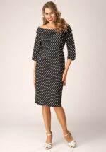 “Shoulders out, dots shout!” De prachtige Gemma heeft een aansluitende fit, een off-shoulder halslijn met een grote speelse omslagkraag en 3/4 mouwen. De ingewerkte siliconen biesjes rond de halslijn voorkomen dat de mouwen afzakken. Ze is uitgevoerd in een soepele en licht stretchy zwarte stofmix voorzien van een witte polkadot. * Pencil model * Off-shoulder halslijn met ingewerkte siliconen biesjes * Grote omslagkraag * 3/4 mouwen * Blinde rits met haaksluiting achterzijde * Split achterzijde * Valt bij een lengte van 1,70 m net over de knie * Melissa is 1,78 m * Let op; de kleur van het product op de video kan afwijken van de daadwerkelijke kleur van het product