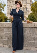 “A tribute to timeless femininity; where soft tailoring meets the romance of Parisian winters.” Deze Giada jumpsuit uit de nieuwe collectie is geïnspireerd op de extraordinaire Marie-Louise Carven; Een baanbrekende Franse couturière uit de jaren 40 en 50! Giada heeft een flatterend, aansluitend lijfje met plooitjes en 1/2 tulp mouwen. Het lijfje loopt uit in elegante wijde pijpen met plooien, dit zorgt voor een spectaculair silhouet. Uitgevoerd in een soepel vallende, navyblauwe stof (stretcht amper) die heerlijk draagt. * Jumpsuit * V-hals met plooitjes * 1/2 tulp mouwen * Afneembare riem, voor een extra ‘snatched’ taille * Knoopsluiting en verborgen rits en drukknoopjes * It has pockets! * Klepzakjes achterzijde * Lange, wijde pijpen