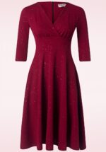 Feestdagen of gewoon een dagje full glamour? Glinda is jouw sidekick! Uitgevoerd in een soepele en stretchy, wijnrode stof voorzien van zilverkleurige glitters. “Glinda is all glitz and glam honey!” * Swing model * Vaste, geplooide overslag * 3/4 mouwen * Brede tailleband * Blinde rits achterzijde * Valt bij een lengte van 1,70 m over de knie