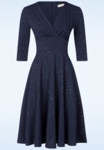 Feestdagen of gewoon een dagje full glamour? Glinda is jouw sidekick! Uitgevoerd in een soepele en stretchy, marineblauwe stof voorzien van zilverkleurige glitters. “Glinda is all glitz and glam honey!” * Swing model * Vaste, geplooide overslag * 3/4 mouwen * Brede tailleband * Blinde rits achterzijde * Valt bij een lengte van 1,70 m over de knie