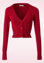 Dit vestje is classy in al haar eenvoud en daardoor DE perfecte match met al jouw vintage kledingstukken! Dit korte model heeft een elegante V-halslijn, lange mouwen en grote glimmende knopen. Uitgevoerd in een fijngebreide, dieprode stof met een heerlijke stretch voor een mooie aansluitende pasvorm. De combinatiemogelijkheden zijn eindeloos! * Korter model * V-halslijn * Lange mouwen * Reeks knopen * Boordjes langs de halslijn, mouwen en onderkant