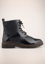 “Classic brogue style with a cruelty-free twist.” Deze Lia veterbooties zijn uitgevoerd in een combinatie van high quality, donkerblauw vegan leder en lakleder met een warme voering en grove trackzool. * Lak/leder look * Imitatiebont voering * Brogue details * Soft foam voetbed * Vetersluiting * Ritssluiting zijkant * Stevige (anti-slip) trackzool * Vegan approved!