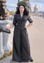 “A tribute to timeless femininity; where soft tailoring meets the romance of Parisian winters.” Deze Lisa jumpsuit uit de nieuwe collectie is geïnspireerd op de extraordinaire Marie-Louise Carven; Een baanbrekende Franse couturière uit de jaren 40 en 50! Lisa heeft een flatterend, aansluitend lijfje met plooitjes en 1/2 tulp mouwen. Het lijfje loopt uit in elegante wijde pijpen met plooien, dit zorgt voor een spectaculair silhouet. Uitgevoerd in een stevige maar soepel vallende, gemêleerde structuurstof stof in zwart met zilvergrijs (stretcht niet) die heerlijk draagt. * Jumpsuit * V-hals met plooitjes * 1/2 tulp mouwen * Afneembare riem, voor een extra ‘snatched’ taille * Knoopsluiting en verborgen rits en drukknoopjes * It has pockets! * Klepzakjes achterzijde * Lange, wijde pijpen