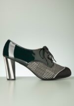 ”We are totally mad… uhm, mod over these shoes!” Uitgevoerd in een combinatie van heel donkergroen lakleder, zwart leder en een zwart suède gedeelte voorzien van een printje! Maar de echte eye-catcher is toch wel de stevige blokhak voorzien van zwart/witte streepjes. Dankzij het voetbed voorzien van zacht foam, lopen ze ook nog als slofjes. De prints, de vorm en het model… meer retro dan dit wordt het niet! * Shoe bootie met vetersluiting * Echt leder/lakleder/suède * Stevige, hoge blokhak * Comfortabel lederen voetbed * Anti-slip zool * Deze kleurcombinatie is speciaal ontworpen voor Topvintage