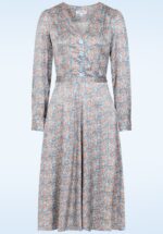 “Grey-blue serenity, brown floral delight.” Magnolia heeft een V-halslijn, lange pofmouwen en een reeks grote knopen. Het striklint accentueert je taille voor een super vrouwelijk silhouet. Uitgevoerd in een stevige, maar soepel vallende satijn-achtige Ecovero viscosemix in grijsblauw, met een bruine bloemetjesprint, voorzien van een hele lichte stretch, die heerlijk draagt. * Midi stijl * V-halslijn * Lange pofmouwen * Reeks knopen voorzijde * Afneembaar striklint, voor een extra ‘snatched’ taille * Zakjes * Blinde rits aan de zijkant * Valt bij een lengte van 1,70 m halverwege de kuit