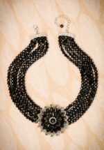 Voel je net zo sprankelend mooi als Audrey met deze 50s Audrey Jet Flower Necklace in Black and Silver! Deze korte ketting is uitgevoerd met 5 rijen kleine, zwarte glasparels en een grote zilverkleurige bloem als eye-catcher. De facet geslepen stenen en strass steentjes maken de glamorous look helemaal af. Deze beauty had Audrey Hepburn beslist ook graag aan haar collectie toegevoegd! * Handgemaakt * Korte ketting * Zilverkleurig metaal * Steentjes * Glasparels * Verstelbare karabijnsluiting * Nikkelvrij
