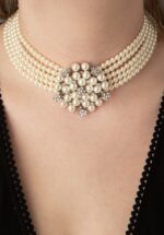 Lovely sieraden! ~ Deze Audrey Cream Pearl Choker Necklace is een korte opvallende ketting met classy parels en strass accenten. De ketting is uitgevoerd in shiny zilver en heeft 5 rijen kleine cremekleurige geregen glasparels. De grote ronde hanger is een echte eyecatcher en bestaat uit bloemvormige strass steentjes met middelgrote parels. Afgewerkt met een handige zilveren karabijnsluiting en verlengkettinkje. Deze tijdloze klassieker is geinspireerd op Audrey Hepburn tijdens haar rol in de film Breakfast at Tiffany’s! Gezien in Vintage Lifestyle, in Für Sie, op yenyangblog.wordpress.com, op thestylishconfessions.com en bij socialite Marijke Helwegen!