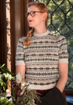 “Vintage vibes, cozy feels.” Deze gebreide top ademt pure winterchic! Ze heeft een hoge hals met knoopjes, korte pofmouwen en een klassieke Scandinavische print die zorgt voor die knusse, stijlvolle uitstraling. Ze is uitgevoerd in superzachte, fijngebreide, stretchy 100% merinowol in een antiek witte tint die je heerlijk warm houdt tijdens de koudere dagen. * Hoge hals * Knopen voorzijde * Korte pofmouwen * Stretchy ribboorden * 100% merino wol