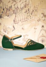 Deze 50s Serpente Flats in Emerald Green uit de ‘Porto’ collectie zijn vernoemd naar de gelijknamige stad waar de Art-Nouveau beweging de stad betoverde met prachtige architectuur die de inspiratie was voor het bekende magische verhaal over jonge tovenaars 😉 Deze flats zijn een ode aan het ietwat duistere Reis Filhos gebouw. Uitgevoerd in high quality, smaragdgroen suède met sierlijke uitsneden op de wreef, een verstelbaar enkelbandje en een lage hak. Duistere magie hoeven we in dit geval vast niet te gebruiken om je te overtuigen… deze flats zitten natuurlijk allang in je shopping bag! 😉 * Suède * Amandelvormig neusje * Verstelbaar enkelbandje * Goudkleurig gespje * Interne hiel (20 mm) * Comfortabel voetbed