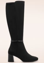 “The higher the boot, the bolder the move.” Deze laarzen reiken tot onder de knie en zijn uitgevoerd in zwart vegan suède met een stevige blokhak en een vast ‘riempje’. * Kniehoge laarzen * Stevige blokhak * Comfy (Touch-it) voetbed * Rits aan binnenzijde * Licht elastische schacht * Anti-slip zool * Vegan approved!