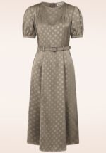 “Polka dots, satin shine, endless style.” Deze midi jurk heeft een hoge halslijn, sierlijke plooitjes, korte pofmouwtjes en loopt vanaf de taille met riem over in een flowy midi rok. Uitgevoerd in een zacht en glanzend, non-stretchy stofje in champagnebruin met de luxe look and feel van satijn en een speels patroon van pokadots. * Midi jurk * Hoge halslijn * Korte pofmouwtjes * Afneembare riem (riemlussen) * Rits- en haaksluiting achterzijde * Valt bij een lengte van 1,70 m tot halverwege de kuit