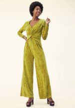 ”She’s a whirlwind!” Deze TE gekke Tassel Tornado jumpsuit heeft speelse franjes op de schouders en een elegant knoopdetail in de taille. Ze is uitgevoerd in een zachte, soepele en stretchy kardemomgroene fluweelachtige stof. * V-hals (met verborgen haaksluiting) * Franje details op de schouders * Knoopdetail in de taille * Lange mouwen * Geen rits of knopen; aantrekken en ready to go! * Lange, wijde pijpen