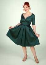 ”Like the stars, you were born to shine!” Met haar overslag halslijn, 1/2 mouwtjes en prachtige smaragdgroene kleur is deze swing beauty een echte eye catcher. Uitgevoerd in een stevige, glanzende taffeta stof met een fijne stretch voor een heerlijke pasvorm. * Semi-swing stijl * V- halslijn met overslag en plooitjes * 1/2 mouwtjes * Met zakken! * Blinde ritssluiting achterzijde * Valt bij een lengte van 1,70 m over de knie