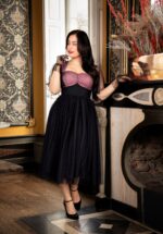 ”Life is a party, dress like it!” Deze Holly swing jurk, exclusief bij Topvintage verkrijgbaar, is uitgevoerd in een stevige maar luchtige stof met een hele lichte stretch in lichtroze en zwart, met een tule overlay voorzien van schattige dotjes. Klaar om te stralen? 😉 * Vol swing model * Gevoerd voor extra comfort * Doorschijnende vlindermouwtjes van tule * Plooitjes bij de buste * Blinde rits achterzijde * Valt bij een lengte van 1,70 m over de knie
