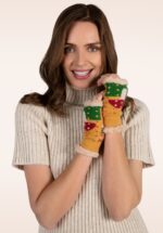 Deze wanten houden je handen lekker warm terwijl jij je vingers nog vrij kunt bewegen… slim toch?! Uitgevoerd in een zacht en warm, mosterdgeel gebreid stofje met een schattige paddenstoel print, afgewerkt en gevoerd met cozy imitatiebont in beige. * Vingerloze wanten * Opening voor de duim * Zacht en warm * Volledig gevoerd met imitatiebont