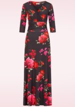 “In full bloom, all the way to the floor!” Ontmoet je nieuwe favoriete jurk voor het komende seizoen. Vivian heeft een prachtige aansluitende overslagtop met een sexy V-halslijn, 3/4-mouwen en een flatterende geplooide tailleband. Vanaf de taille loopt ze over in een chique, lange maxirok. Ze is gemaakt van een glad, licht glanzend en soepel stretchy slinky stofje in zwart met een all-over print van kleurrijke bloemen. * Maxi jurk * Volledig gevoerd m.u.v. de mouwen * Vaste overslag * 3/4 mouwen * Geplooide tailleband * Geen rits of knopen; aantrekken en ready to go! * Reikt tot op de enkel bij een lengte van 1,70 m