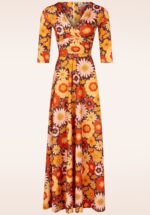 “Draped in aubergine and golden blooms… like a sunset at Woodstock.” De top heeft een vaste overslag, 3/4 mouwen en een super flatterende, geplooide tailleband. Uitgevoerd in een soepele, maar stevige en stretchy stof met een print van retro bloemen in oranje en geeltinten die heerlijk draagt. * Maxi stijl * 3/4 mouwen * Gevoerde top * Blinde rits achterzijde * Reikt tot aan de grond bij een lengte van 1,70 m * Exclusief bij Topvintage verkrijgbaar